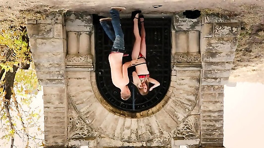 Blonde in black thigh-highs kneels to suck dude&039;s cock outdoors