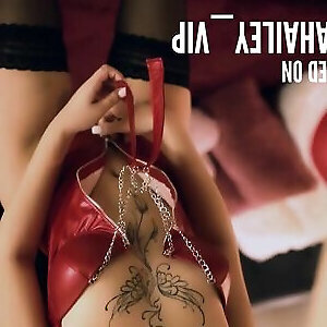 Sumptuous whore with red cutoffs and black Basque dances leisurely for you