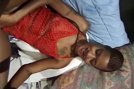 chica de color oscuro en un festival de sexo rectal de tres vías