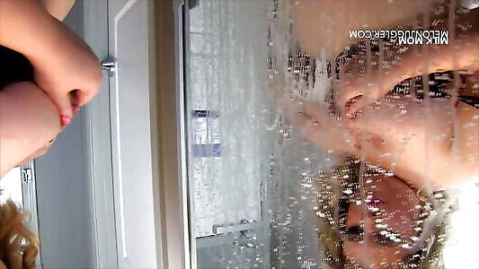 esposa rubia ordeñando sus grandes tetas en el espejo