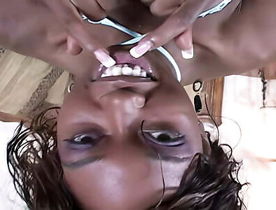 la ninfa de color oscuro está frotando su coño húmedo mientras hace gárgaras con una polla