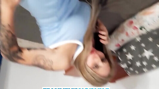 la hermanastra de ponytails acaricia el coño para el padre en el punto de vista después de las burlas
