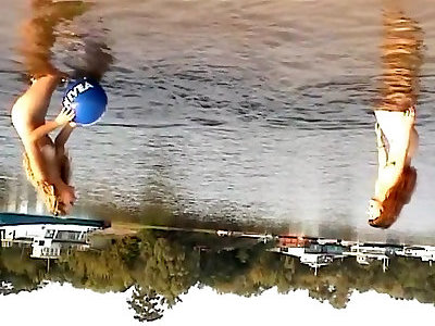 espectáculo de poon al aire libre. dúo desnudo juega en la piscina naturista al aire libre. regina noir breve 2