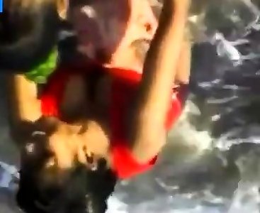 2 mujeres indias con hombre blanco en la playa tienen alegría chupar