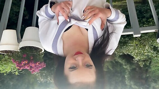 красотка с большими сиськами мастурбирует на улице под дождем, она такая возбужденная