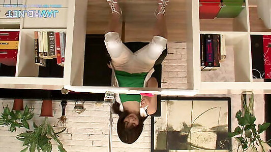 вид из-под стола на то, как японка в короткой юбке сидит на стуле в квартире, читает порнокниги и наслаждается работой пальцев