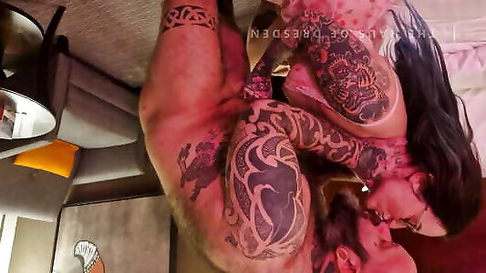 коротко стриженная татуированная девушка скачет на большом члене своей огромной задницей