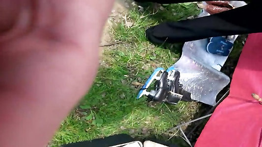 похотливая женщина в темном сарафане дает ему прекрасный минет