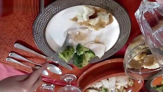 возбужденная домохозяйка ублажает свою пизду пластиковым дилдо, сидя на столе