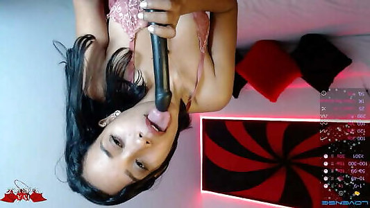 пухленькая брюнетка трахает свое горло и жопу двойным дилдо из жопы в рот