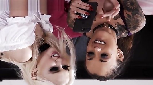 порно втроем - 2 крошки, негритянка и красотка с татуировками трахаются в жопу межрасовым сексом втроем