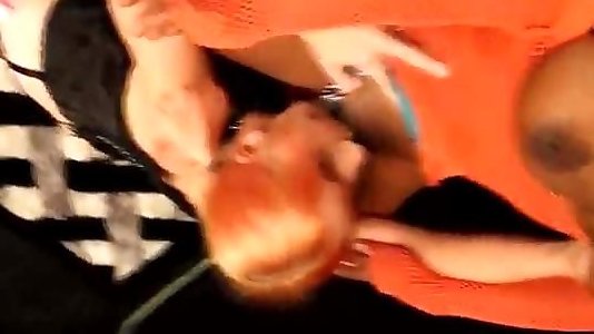 рыжая с блестящими сиськами поклоняется своей ноге и получает косточки