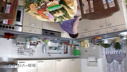 немецкая толстушки снимает свой халат домохозяйки и получает вылизывание своей киски, в то время как ее большие сиськи сжимаются
