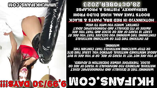 hotkinkyjo в красном лифчике, брюках и черных сапогах берет в анал огромный фаллоимитатор от mrhankey, фистинг и выпадение волос