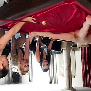 женская групповуха разрушает его мешок с мячом на бильярдном столе