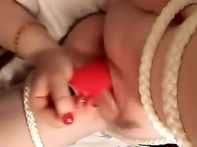 покорная милая девушка в наручниках, получающая удовольствие от самоудовлетворения