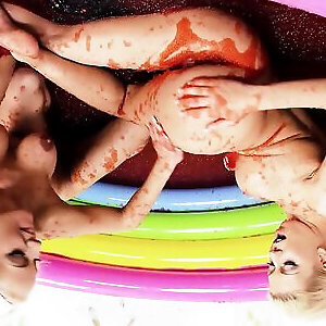 похожие на барби платиновые блондинки лесбосы с большими фальшивыми кексами лапают друг друга в луже, полной клея