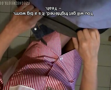 косплей-горничная в колготках и рукавицах из спандекса сливает любовную пуговицу размером с батат и обширную рану