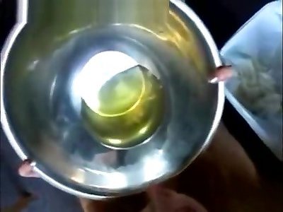 черный в лифчике и трусах мочится в контейнер, прежде чем проглотить его