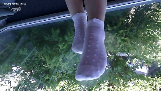 хозяйка дразнит ножки в милых прозрачных белых нейлоновых носках на открытом воздухе
