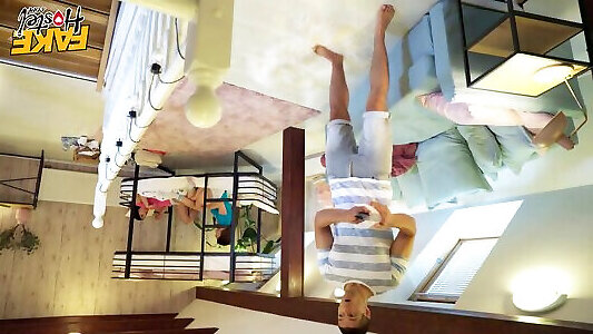 худенькая азиатская брюнетка испытывает оргазм, катаясь верхом на длинном члене в позе обратной наездницы на кровати
