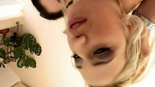 блондинка играет со своей подругой и сосет много толстых членов стоя на коленях до кульминации