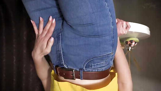 сексуальная мамаша дразнит свою большую камелтое в обтягивающих синих джинсах