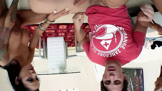 Bitch gets a double penetration after sucking two monster cocks deepthroat