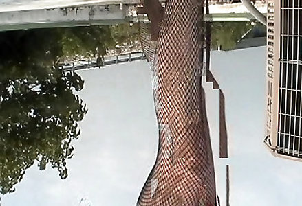 T-girl poses, strokes and spunks in black nylons