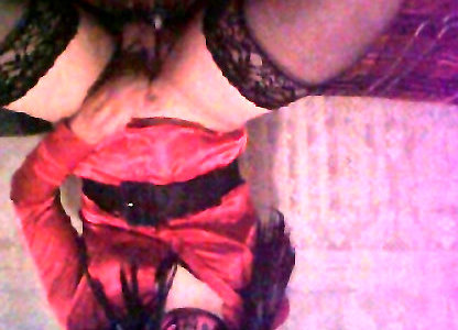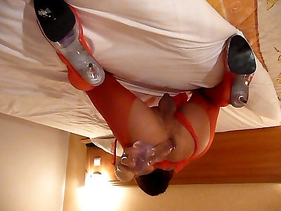 Sissy secretary in silk satin crimson wide gam pants, high high-heeled shoes and college office blouse waiting her wife to be porked