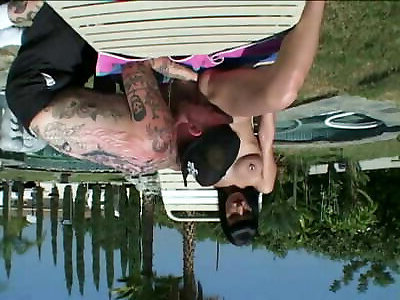 Raven haired bombshell with good bra-stuffers deepthroats and pokes tattoed man outdoors