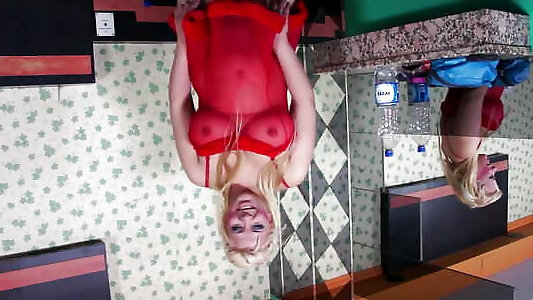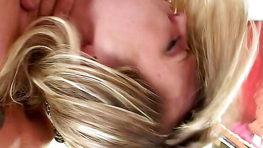 Platinum-blonde adult movie star bitch rides lollipop, then man finishes off on her toes
