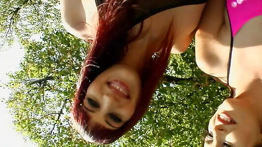 Busty ebony pounds her girlfriend tight pussy with a big strapon outdoor