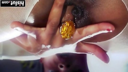 Leather lovin’ hairy ebiony Dark-hued opens up her sphincter with a phat dildo