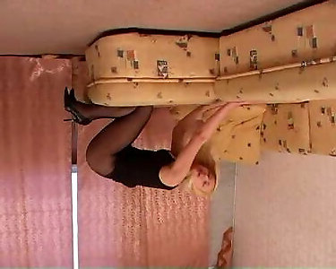 Super-sexy ash-blonde with shapely legs taunts in tall ebony high-heeled slippers