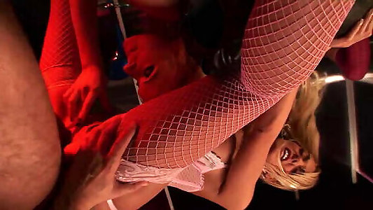 Blonde Mistress and Her Babes Get All Tight Holes Fucked Hard by a Masked Man with Huge Cock