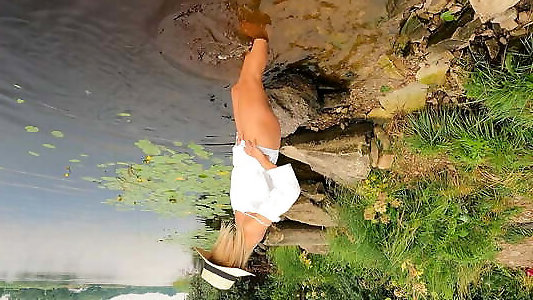 Magnificent ash-blonde doll go swim in dress. Public bare.