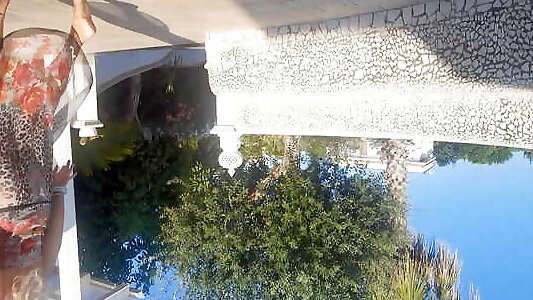 Platinum-blonde housewife sits by the pool when fellow comes to screw her