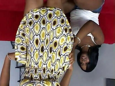Two huge ebony whores in maid costumes do some labia diving in couch
