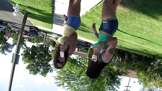 2 frisky young brunettes gobble each other on the grass Sixty-nine style