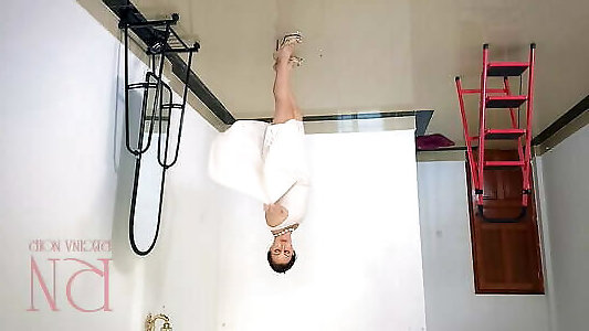 Regina Noir attempting on high high-heeled slippers. Striptease in milky underwear and stocking Milky stocking and high high-heeled slippers. Depraved 5