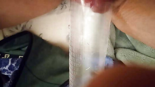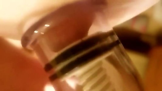 Tonight I premiere a cock pump and I make her sprinkle her cum with my oiled hand