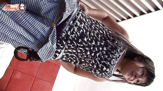 brunette dominates pervy Asian guy and lets him cum on her tits