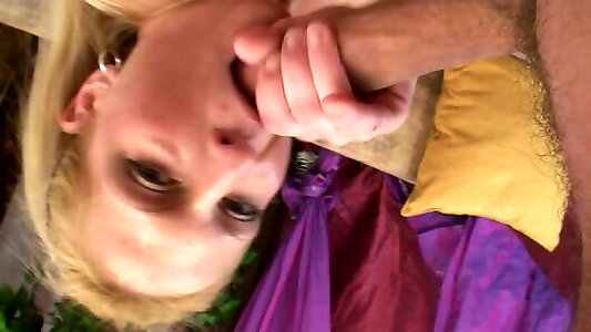 Chubby blondie has faux-cock tear up and deep-throat – gets jizz on face