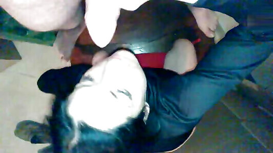 Stepmother in collar and leash showing her stepboy her deepthroat skills