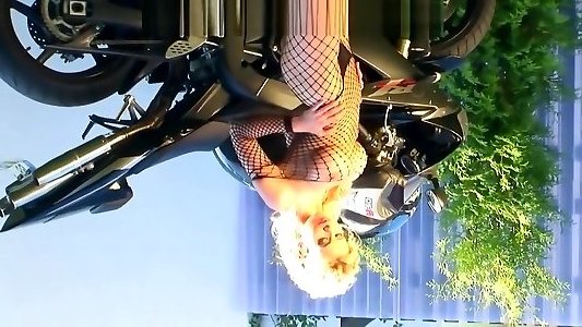 Huge-boobed Caylin teases on a motorcycle in a fishnet bod tights and shoes