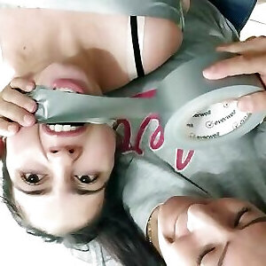 Topless chubby brunette helping her friend get rid of her gag reflex, deepthroat training