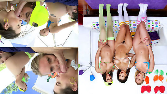 Gulped AJ, Keisha and Violet share and gag on monstrous jizz-shotgun