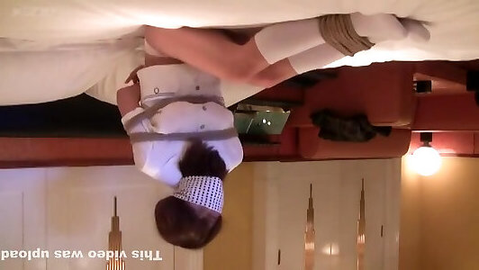 Schoolteacher trusses and gags bad schoolgirl to a stool cable bondage