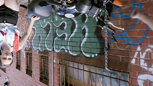 Sizzling huge-chested blonde girly-girl gets tongued next to her motorcycle